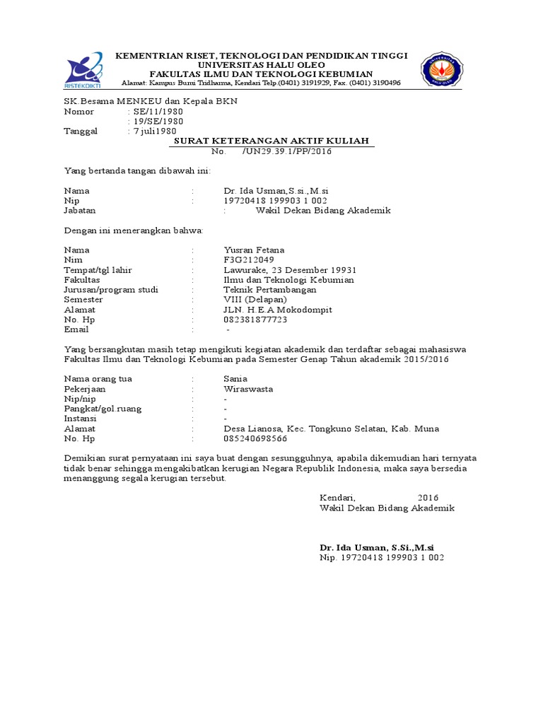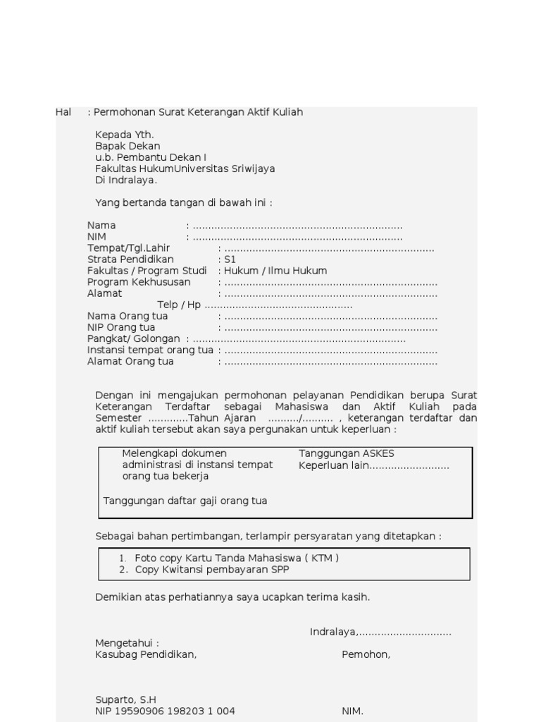 Permohonan surat keterangan mahasiswa aktif fakultas teknik. Biasanya pengajuan cuti kuliah dipengaruhi oleh banyak faktor, ada yang karena kuliah sambil bekerja dan harus tugas selama setahun, maka terpaksa mengajukan cuti kuliah. Surat permohonan aktif kuliah juga memiliki unsur unsur yang harus ada dalam surat tersebut. Semua informasi yang anda input di sini tidak akan disimpan. Find out the most recent pictures of contoh surat keterangan aktif kuliah unsrat here, so you can obtain the picture here simply.